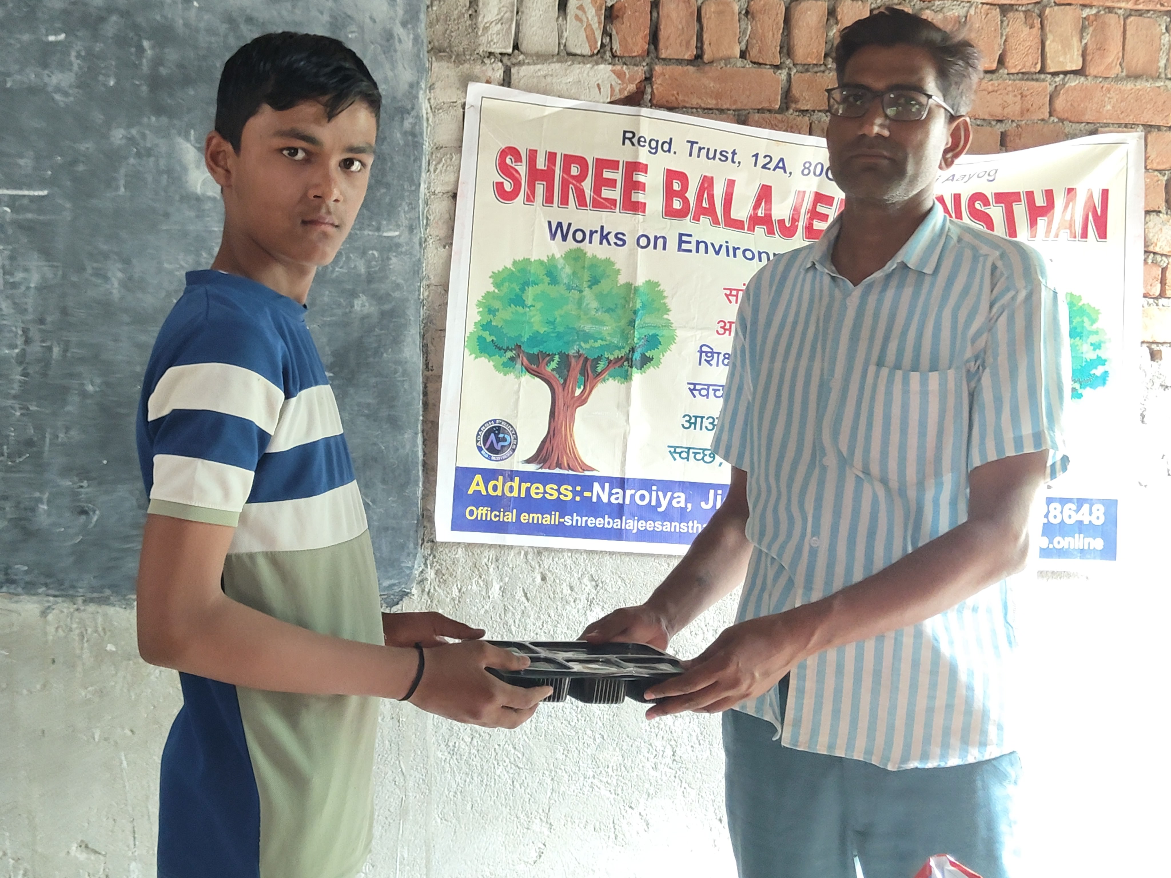 The State President of Shree Balajee Sansthan distribute the food products.